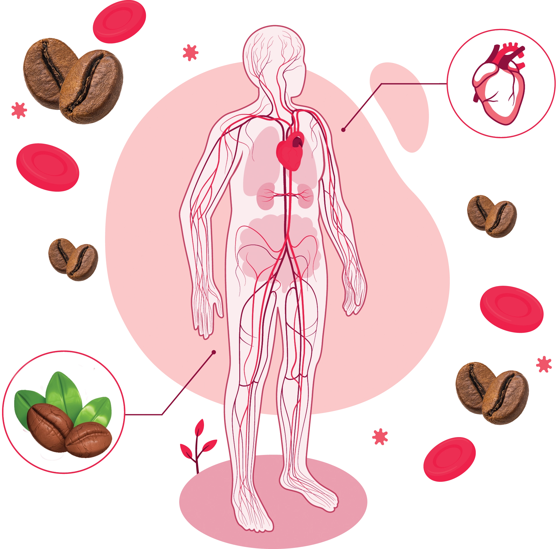 Narodowe Centrum Edukacji Żywieniowej – Instytut Żywności i Żywienia wskazuje, że regularne picie kawy nie zwiększa ryzyka nadciśnienia tętniczego, jedynie buduje tolerancję na te efekty kofeiny. Co więcej, w jednym z badań w przeciągu sześciu lat odnotowano obniżenie ciśnienia krwi. Pijąc kawę na co dzień, jesteśmy pod wpływem kwasu chlorogenowego, który usprawnia funkcjonowanie śródbłonka naczyń, jednocześnie zapobiegając miażdżycy. Dodatkowo rozszerzenie żył niweluje powstawanie żylaków i zapobiega bólom migrenowym. Picie jej w rozsądnych ilościach dba o kondycję tętnic oraz działa przeciwzapalnie.