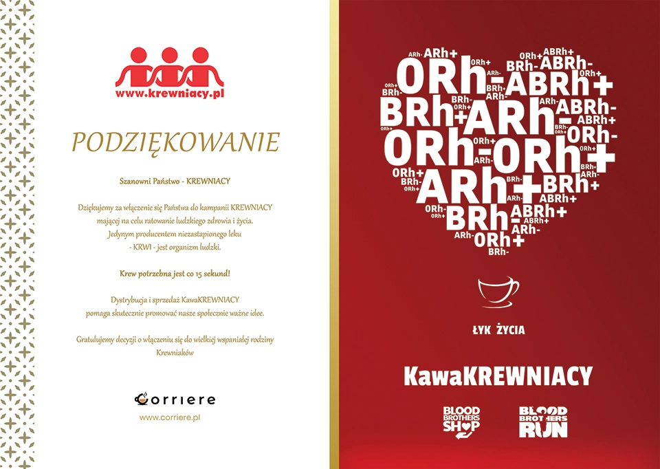Korzystając dla zdrowia i przyjemności KawaKREWNIACY uszczęśliwiasz przy okazji (nic więcej nie dopłacając) nie tylko siebie ale też tych, którzy żyją dzięki krwi, która jest niezastąpionym lekiem. Jakość i smak naszej KawaKREWNIACY są dokładnie takie same jak tej, którą pijemy codziennie. Przyznasz, że to niezwykłe. To nasza codzienna filozofia pracy dla Ciebie i tym którym pomagamy.